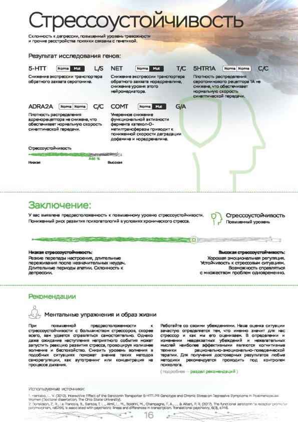 Этот ДНК анализ показывает влияние наиболее важных 10 генов на психическое и эмоциональное состояние. Именно они регулируют выработку гормонов, работу нейромедиаторов. Используйте знания о природных свойствах своего организма для борьбы со стрессом, повышения работоспособности и общего тонуса. Каждый человек индивидуален, поэтому мы рекомендуем пройти наш генетический нейро тест в Мелеузе.